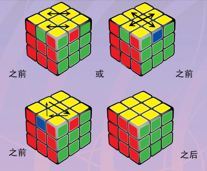 7、我们将顶层(应该是黄色)边块调整向上,做出黄十字。如果我们按照口诀转动1次后,顶层没有出现黄色十字,就重复按口诀转动,直至黄色十字出现即可。