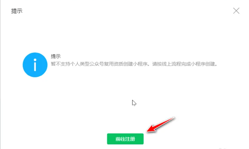 提示窗口中点击前往注册,按照流程注册创建小程序即可。