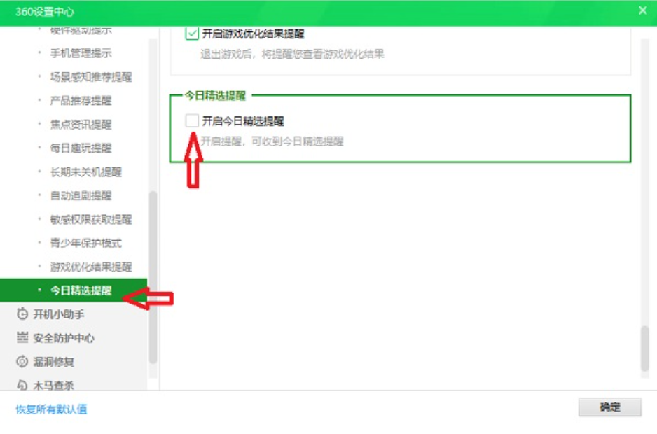 3、然后里面往下拖动,选择今日精选提醒,在右侧窗口取消勾选开启今日精选提醒,点击确定即可。
