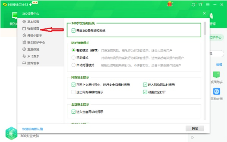 2、在左侧列表选择弹窗设置。