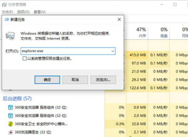 3.接着输入explorer.exe确定。等待系统重启就可以正常使用了。