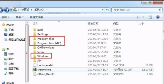 1.首先我们需要知道C盘是系统盘,安装系统所在的文件夹一般就是Windows这个文件夹,还有一个那就是安装程序所用的的文件夹Program Files或Program Files (x86)。这两个文件内的东西我们先不要动。