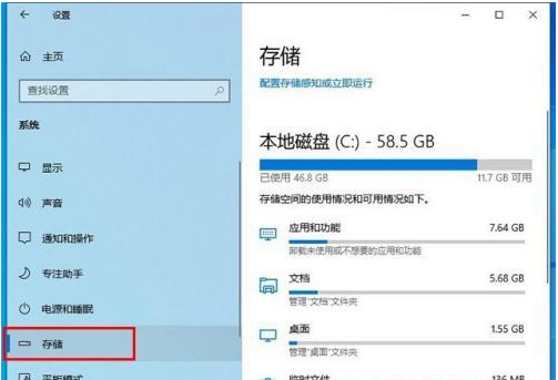 3、点击右边栏中的“存储”,在点击右边栏中的“应用和功能”。
