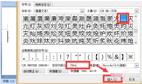 5、在字符代码中输入“706c”,即可自动选中“灬”,点击“插入”即可。