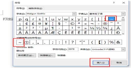 2、在“其他符号”的界面中,找到【~】,单击“插入”即可完成波浪线的符号。