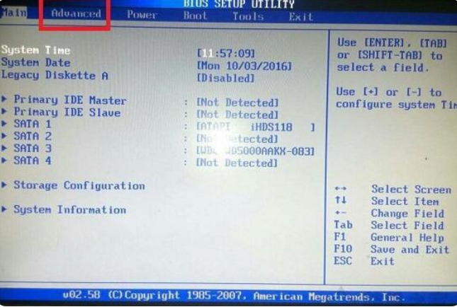 1、点击“DEL”键进入BIOS设置,选择Advanced;