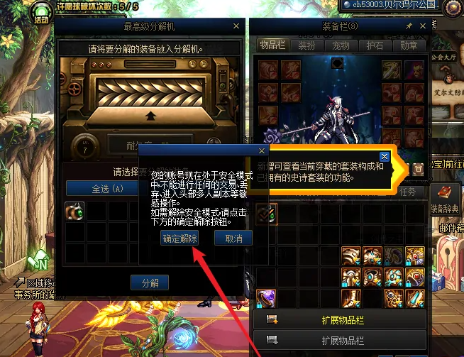 1、首先登陆dnf游戏界面,点击游戏界面弹出的安全模式窗口中的【确定解除】按钮。