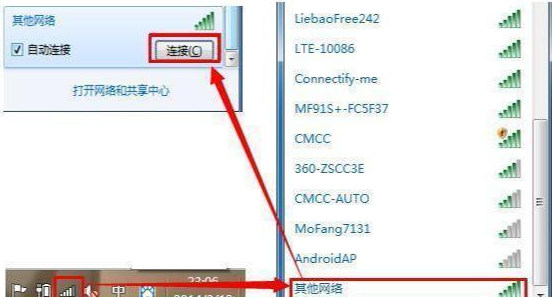 1、在电脑桌面右下角任务栏点击【无线图标】进入,这时会显示搜索到的无线网络列表,点击最底部的【其他网络】。