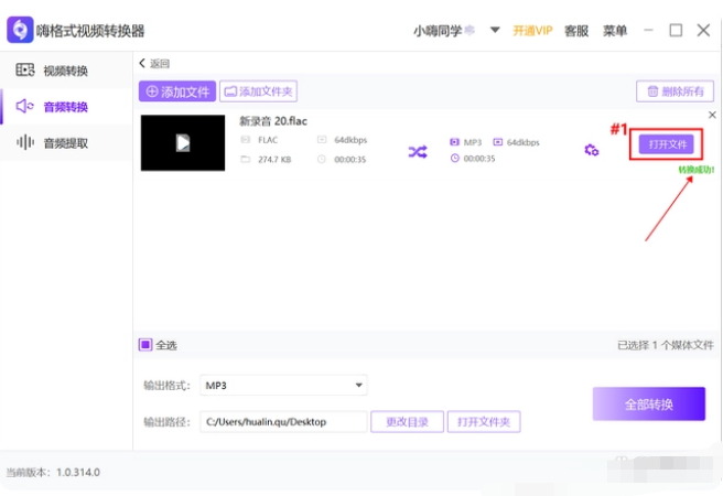 3、完成以上设置后,点击「全部转换」就可以开始转换辣。耐心等待音频转换完成,转换完成后,在音频的右下方会提示「转换成功」。