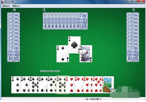 4、本轮出现红桃牌的话,右边玩家因为没有没花花色的牌选择出红桃牌等,另外三家梅花牌里最大的玩家就会得这1分,就是梅花六的用户。