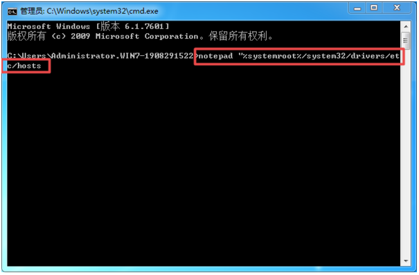 2、在命令窗口当中,输入【notepad "%systemroot%/system32/drivers/etc/hosts】命令,然后按下回车键。