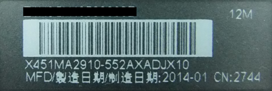 一般翻到华硕笔记本的背面(底部),找到如下图图所示的贴纸,即是笔记本的型号。例如:此外信息为X451MA2910,那么笔记本型号则为 X451MA。