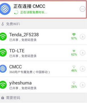 2、如果有CMCC、ChinaUnicon、ChinaNet、这种WiFi图标直接点击链接即可,这三种属于360用户专属免费WiFi,开始每个用户都会享有免费1小时上网时长。