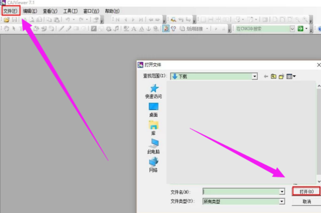 3、点击左上的“文件”,找到要打开的CAJ文件,再点击对话框里的“打开”即可。