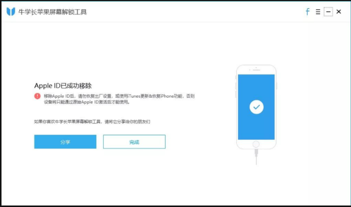 (3)“查找我的iPhone”已关闭。软件检测到设备之后立即解锁,整个移除过程仅需要几秒钟,直到出现移除成功页面。