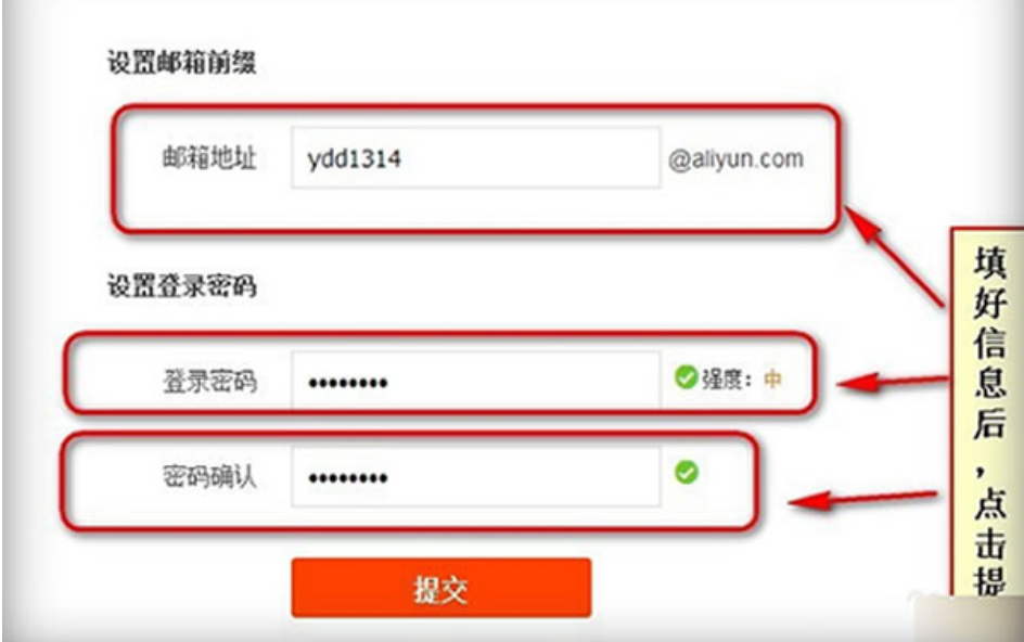 4.手机短信验证码成功后,进入到邮箱账号编辑界面,主要内容有邮箱地址和登录密码,填好邮箱地址、密码信息后,点击提交即可。