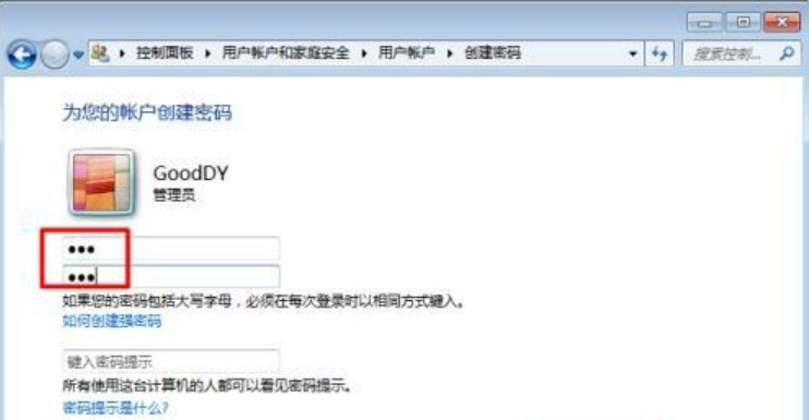 进入“控制面板”、“用户帐户和家庭安全”、“用户帐户”,点击“为您的账户创建密码”,输入密码,点击“创建密码”。