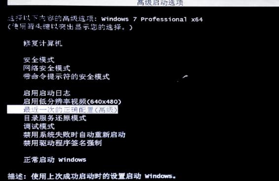 电脑开机以后,反复按键盘上方的“F8”键,不停地按,直到出现如图的画面。然后按键盘上的方向键,移动光标到“最近一次正确配置(高级)”上,然后按“回车”键,电脑就能顺利启动了。这个方法可以解决70%的电脑开机蓝屏故障。有的电脑“F8”键和开机选择启动设备选择项冲突,出现选择启动设备的时候,选择启动磁盘,按一下“回车”键,继续按“F8”键即可。