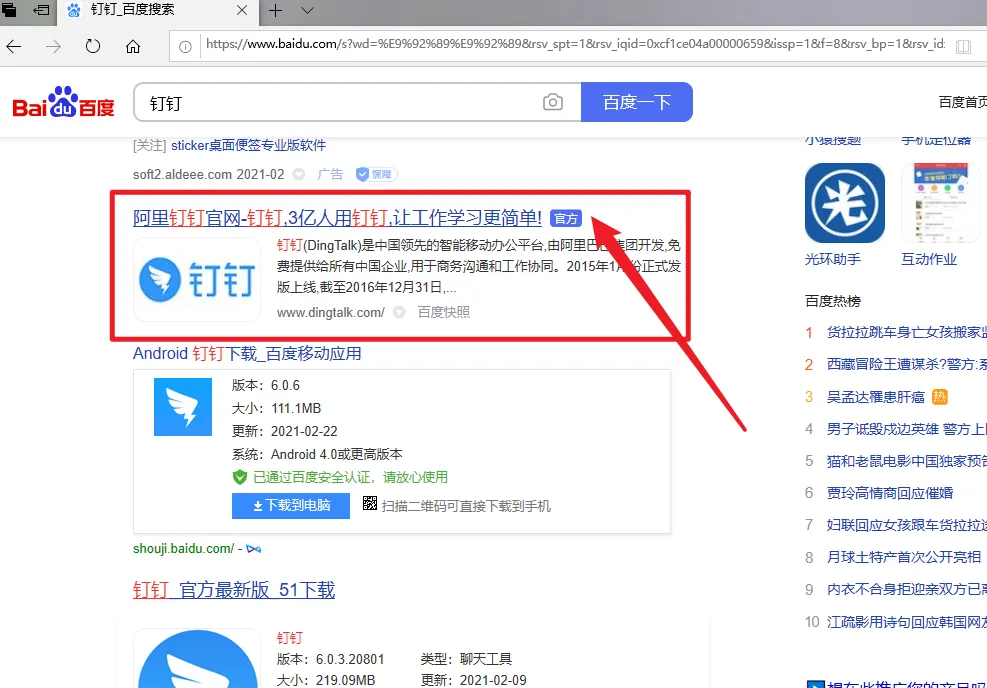 1、钉钉电脑版怎么下载安装,首先百度搜索钉钉官网,进入官网。