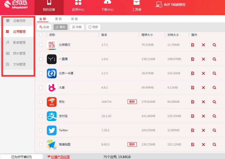 3、左侧工具栏可以查看管理手机中的应用和资料数据。