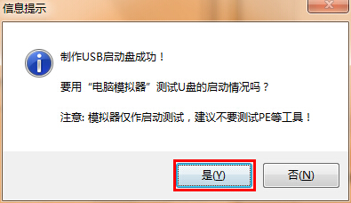 9.当制作完成后会弹出“信息提示”,点击“是(Y)”按钮即可进行模拟启动;如下图所示: