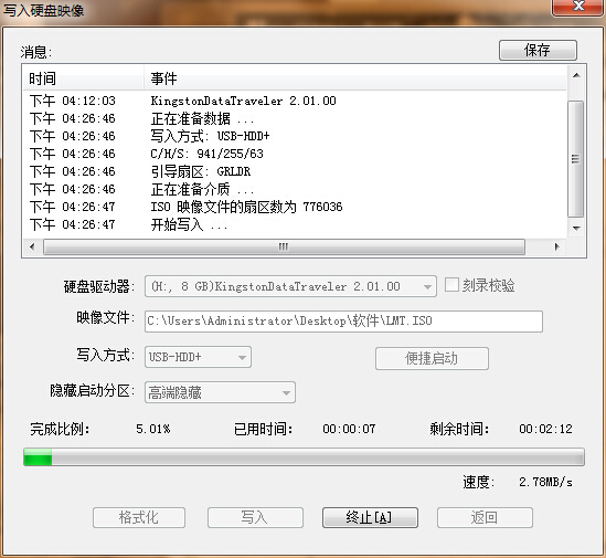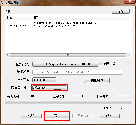 6.在弹出的写入硬盘映像窗口中,我们找到“隐藏启动分区”的选项,使用鼠标将其选择为“高端隐藏”,然后按下“写入”按钮即可;如下图所示: