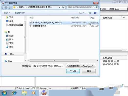 启动UltraISO,点击“文件”菜单下的“打开”按钮,打开已准备好的ISO镜像文件,如JINHU_SYSTEM_TOOL_2009.iso