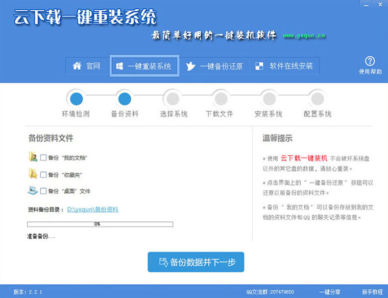 3、选中要备份的内容,点击”备份数据据并下一步“按钮,自动将文件备份到相应的目录下。