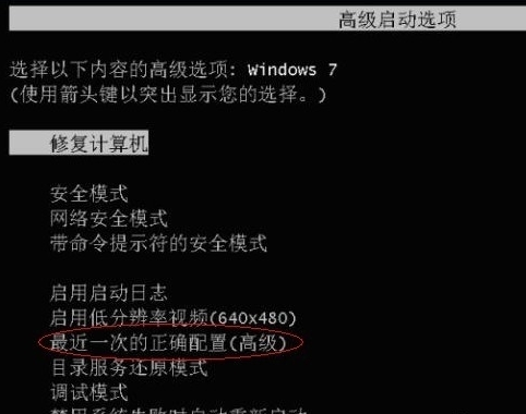 1、重启电脑,在未出现开机界面前一直按F8,进入安全模式里高级启动选项,选择最后一次正确配置