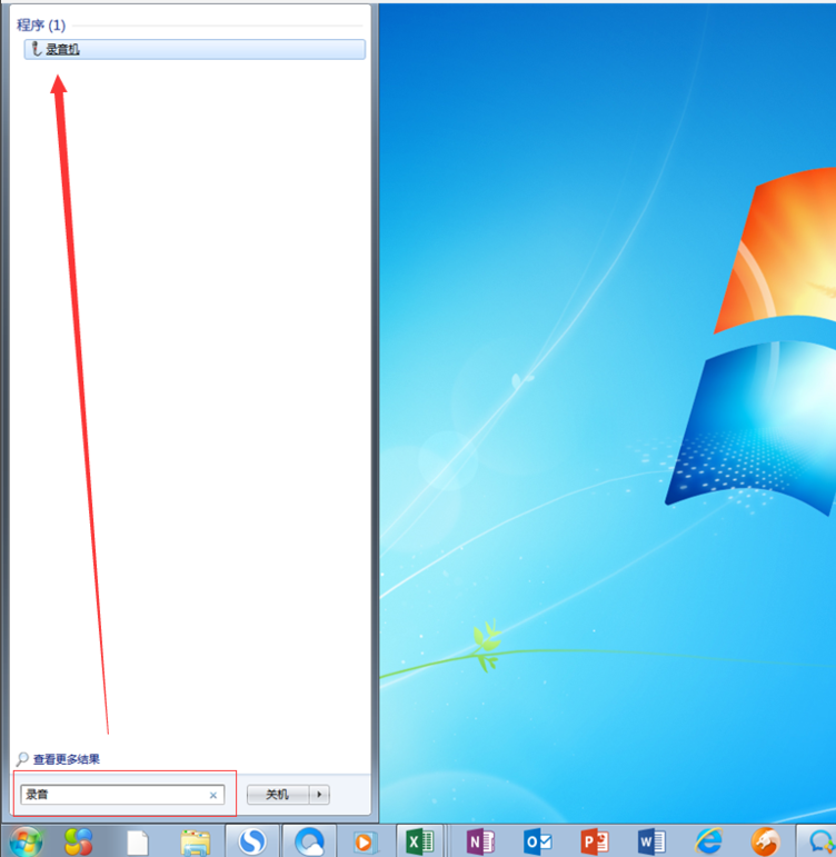 1.进入win7系统桌面,点击开始按钮,在弹出的开始菜单下方的搜索框中输入“录音”,然后在搜索结果中找到录音机打开,进入下一步。