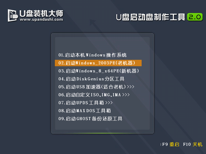 在U盘装机大师的主菜单界面中通过方向键选择“02.启动Windows_2003PE(老机器) ”(U盘装机大师主菜单上的“02.启动Windows_2003PE(老机器)”或者“03.启动Windows_8_x64PE(新机器) ”两个版本的PE系统都可以选,用户可以根据自己的电脑配置而定,这里由于笔者的电脑配置较旧,所以选择2003PE(老机器)版本)。选中后按下回车键,就可进入PE系统,然后就可以按以下步骤安装系统。