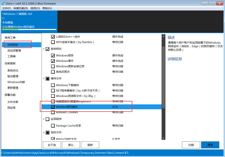 dism++ 上面显示:WinINet网页缓存这个选项占了14G多,丧尽天良啊!对应的路径是:C:\Users\Administrator\AppData\Local\Microsoft\Windows\TemporaryInternet