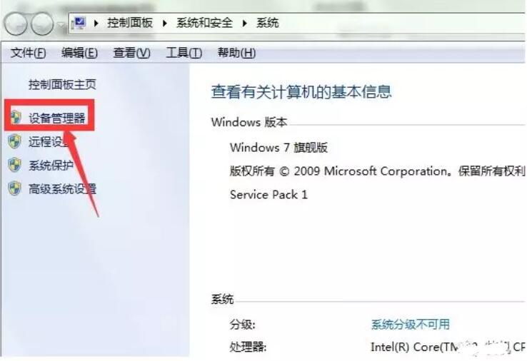 选择桌面上计算机图标点击右键进入属性,找到左侧设备管理器进入