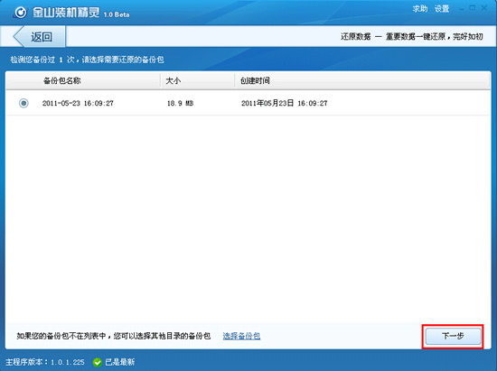 重装系统完成,电脑重启后进入桌面,自动启动金山装机精灵。点击“下一步”,进行数据还原。
