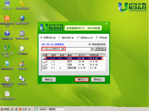 5、进入到winpe系统之后双击打开桌面上的“u启动pe一键装机工具”,打开之后我们会看到装机工具已经自动检测到了GHO镜像路径,我们就不用再去管它了,点击下面的”确定“,然后弹出窗口提示在”完成后重启“前打勾,点击”确定“。然后就开始漫长的等待了。。