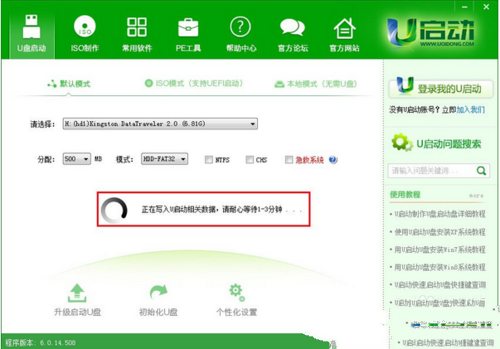 2、安装完成后,插入U盘,选择”一键制作U盘“,弹出框选择”确定“,然后开始制作。u盘启动盘制作完成后会弹出一个是否进入“电脑模拟器”测试u盘的启动情况,我们选择”否“,然后退出软件,这时我们在”计算机“会看到,U盘的名字已经变成"U盘启动盘"了。