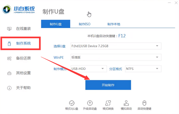 1、首先我们将电脑插入u盘,打开桌面上的小白一键重装系统软件,这时等待软件检测完成后进入主界面,选择左侧的制作系统功能,点击开始制作。