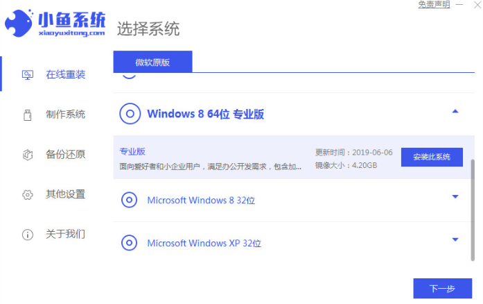 1、先在电脑上下载安装小鱼一键重装系统工具并打开,关闭电脑的杀毒软件,备份c盘重要资料。然后选择需要安装的win8系统点击安装此系统。