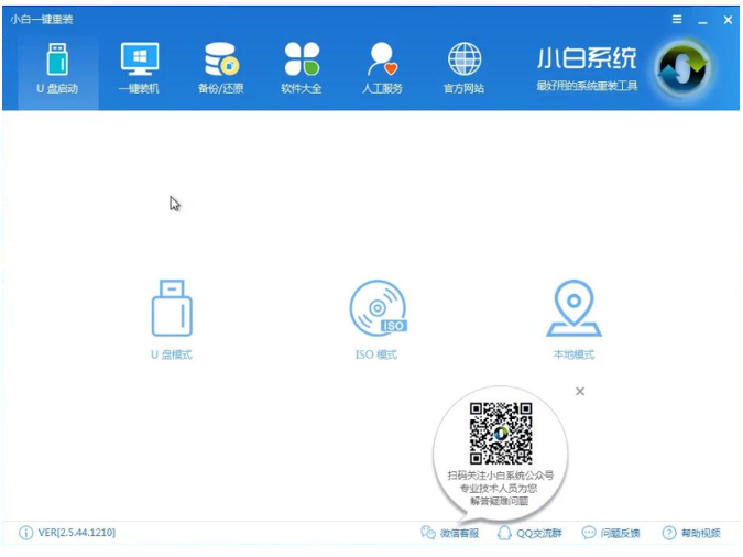 1、把U盘插到电脑USB接口,运行小白一键重装系统软件,切换到U盘启动——点击U盘模式。