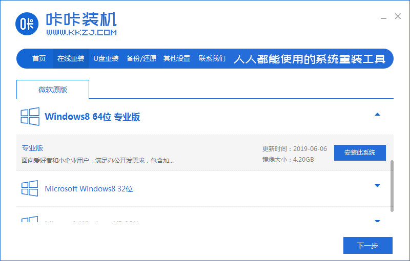 1.打开【咔咔装机】进页面后,选择我们想要重装的系统,选择完成后点击右侧的安装即可。