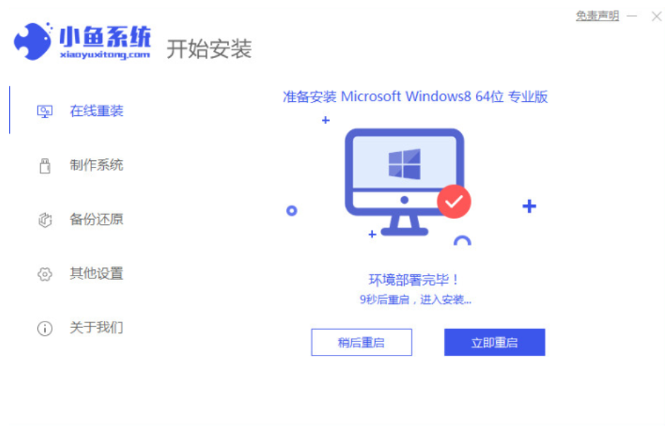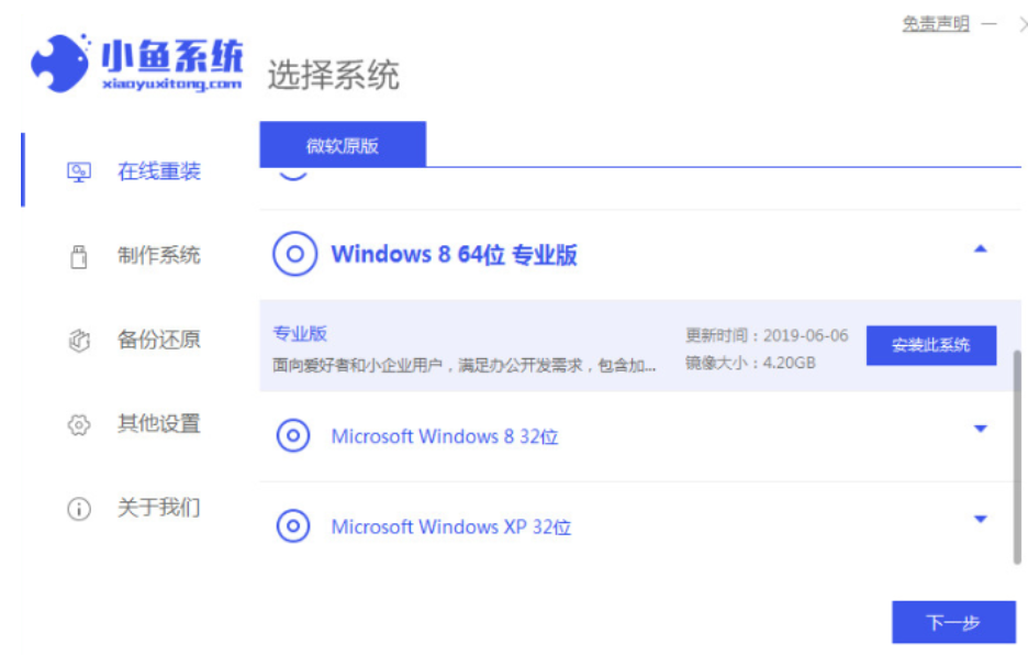 1、先在电脑上下载安装小鱼一键重装系统工具并打开,关闭电脑的杀毒软件,备份c盘重要资料。然后选择需要安装的win8系统点击安装此系统。