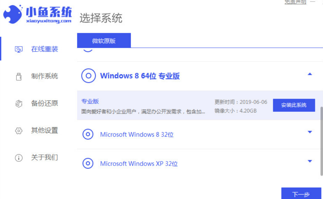 1、我们在浏览器中下载好小鱼一键重装软件,打开小鱼系统软件后,点击安装win8系统,选择后点击下一步。