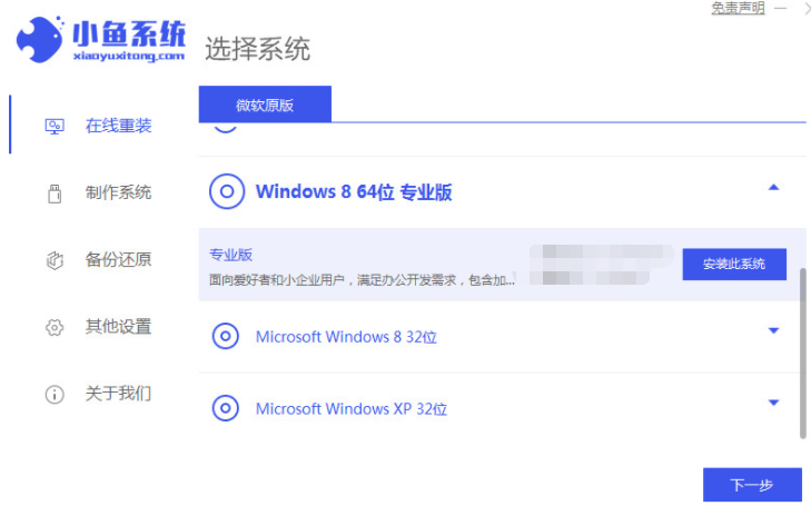 1.回到电脑桌面,打开我们的小鱼一键重装软件下载。进入软件主页后,点击安装win8,选择后单击下一步。