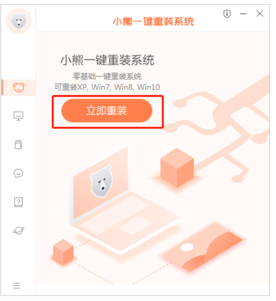 1、下载小熊一键重装系统软件。下载结束后,关闭所有杀毒软件,然后打开软件点击“立即重装”。