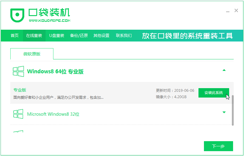 1、自行网上搜索并下载安装口袋装机一键重装系统工具打开,选择要给电脑安装的win8系统,点击安装。