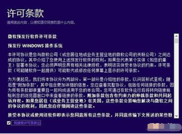 1.将从网络上下载下来相对应的32位或者是64位的ISO系统镜像包打开,运行之后跳转到以下界面,勾选“我接受许可条款”然后点击“下一步”进入下一步操作。