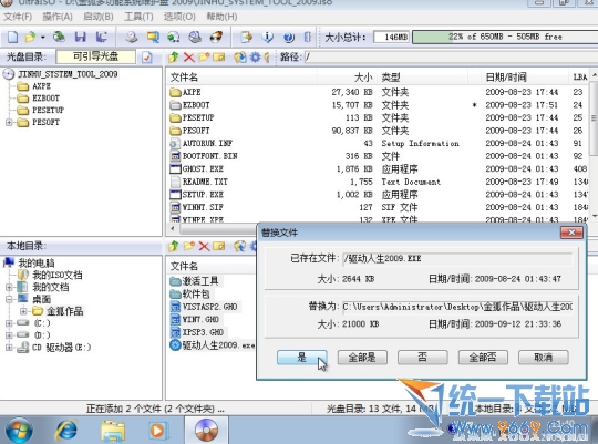 由于维护盘不含GHO系统文件,所以刻录时需添加,刻录前已经在桌面上新建了一个“9669文件夹”的文件夹,里面放了WIN7.GHO、VISTASP2.GHO、XPSP3.GHO三个系统文件,还有“激活工具”以及“软件包”,准备用驱动人生2009带网卡驱动的单文件版替换原来不带网卡驱动的版本。相关方法如图示,在UltraISO界面左下角的“本地目录”里定位到桌面上的“9669文件夹”这个文件夹,它里面的所有文件会在右下角显示,把要加入ISO镜像的所有文件选中后按住鼠标左键拖到右上角的区域。