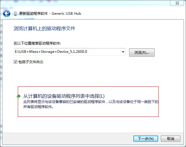 3、如果你已经知道你要安装的U盘驱动程序所在的路径,你可以直接点击“浏览“,然后选择,之后可以点击下一步,然后等待驱动程序安装完毕即可;当然,如果你没有相应的USB驱动,则你可以点击“从计算机的设备驱动程序列表中选择”,然后点击“下一步”,如下图所示: