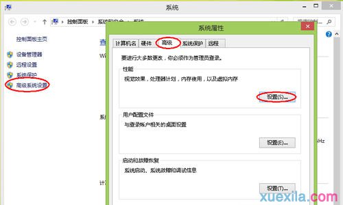 3.然后在系统属性窗口中,点击“高级”,再点击“设置”,如下图所示。