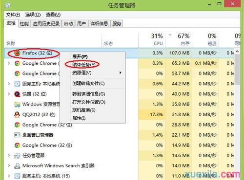 如下图所示,我的进程管理中显示“Firefox”这个应用程序所占用的内存很大。我现在没有使用Firefox来浏览网页,所以我可以把这个应用程序关闭掉,或者直接从任务管理中把这个进程结束掉,从而释放更多的内存空间出来。